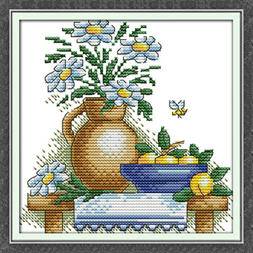 Delightful Daisies... Counted Cross Stitch Kit by Sensations. Size: 5.5"x 5.5" (14 x 14cm) Daisies look great in whatever vase there displayed in, and our blue daisies look terrific displayed with an accommodated bowl of sweet lemons using 19 corresponding colors which make up this lovely still life display. Being a MINI design, it would make an ideal weekender project!