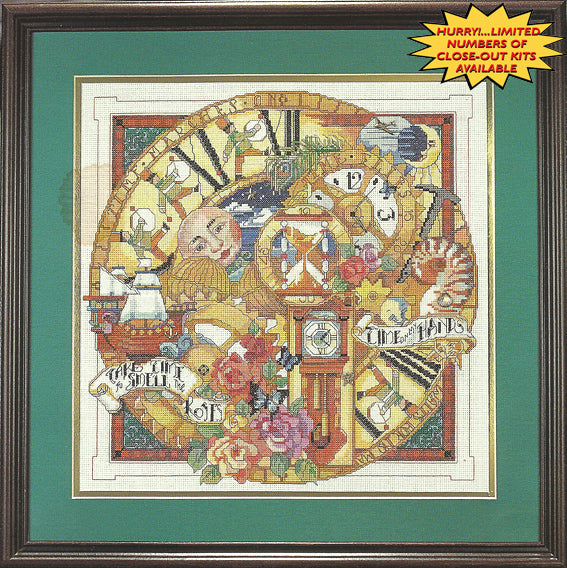 It's about Time... Counted cross stitch Art Kit by Bucilla. Size: 14"x 14" (35.5 x 35.5cm) This is a lovely attractive and very detailed as well as colorful time piece that illustrates time and place for you to display in a cross-stitch that will express your belief that time never stands still, and also your talents in needlework which are both so evident in this finished design, and would also enhance any distinguished wall in your home such as an office, library, den, or reading room... "This design size could also be stitched as a Pillow!... STITCHING ABILITY: MODERATE. Artwork Design by Joy Marie.