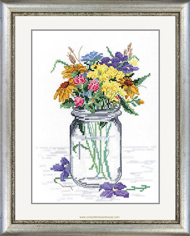 Wildflower Jar... Counted Cross Stitch Kit, Made in the USA by Janlynn. Size: 8"x 10" (20 x 25.4cm) Wildflowers are beautiful especially displayed in this jar for that back home look & feel. You will enjoy the colors of purple, yellow, gold and many more in this simple clean and easy-to-do design!