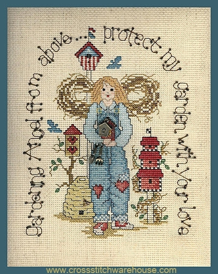A Gardening Angel... Cross Stitch CHART by Sue Hillis Designs. Size: 6"x 7.5" (15.2 x 19 cm) Size In Stitches is: 85 wide by 106 high. Everyone needs a guardian angel at some time in life, even your garden! This sweetheart Angel watches over your plants and blooms with special love. When stitched on 14ct. Fiddler's Cloth fabric or "over two threads" on 28ct, this project will fit perfectly into a standard 8"x 10" Frame. The chart includes gardening charms.