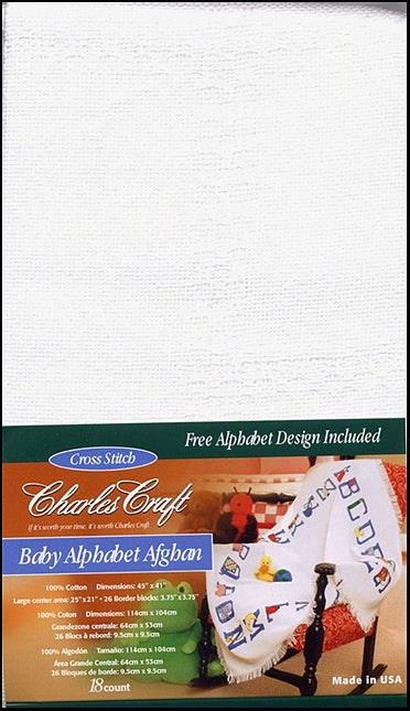 Baby Afghan Nursery Time... Color: White 18 ct. Afghan. Extra-Large Size measures 41”x 45” (104.1 x 114.3cm) This beautiful woven Cross Stitch 18-count Afghan is made of 100% cotton, and measures 41”x 45”. The central design area is 21"x 25” (53.3 x 63.5cm) and is bordered by twenty-six 3.75” (9.53cm) blocks. The special finish lends to stability when stitching, and becomes BabySoft™ when washed. Fringing instructions & alphabet design book included. Or, choose your own suitable design to complete a special one-of-a-kind piece.