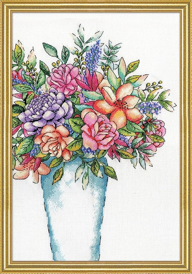 Aqua Vase... Counted Cross Stitch Kit by Design Works. Finished Size: 10"x 14" (25.4 x 35.5cm) Aqua Vase, features a colorful collection of assorted flowers. The blend is so serene in this Cross Stitch design. A beautiful still-life portrait, cross-stitched on a fabric that highlights the subject piece.