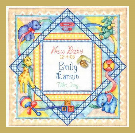 Birth Sampler... Cross Stitch KIT by Bobbie Gee Designs. Size: 9.8"x 9.8" (24.9 x 24.9cm). A delightful Birth Record cross stitch Design for your new bundle of Joy. Design size would also make a lovely nursery pillow.