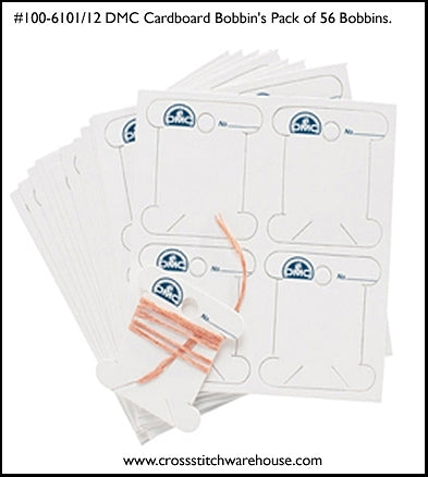 Cardboard Floss Bobbins... Pack of 56 Bobbins by DMC. Cardboard bobbins are a necessary item for cross stitchers. Conveiently used for winding DMC Floss onto bobbins for easy storage. These high quality, white cardboard bobbins are printed with the DMC logo, plus an area for the DMC color number. Packed with 56 cardboard bobbins per pack, DMC offers 10% more (56 vs. 50 cards) than other brands, at the same value price.