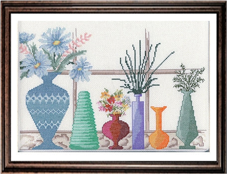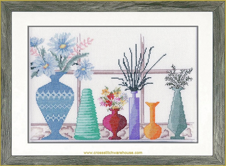 Bottle Collection... CHART. Stitch Count: 117v x 180h. Size Approx: 9"x 13" (23 x 33cm) A lovely modern Abstract style picture in soft colors showing an assortment of bottles. A cross stitch design by Renowned cross stitch designer Karen Ann Kresyman. Cross Stitch pattern by The American Imaginating Studio. Cross Stitch model is stitched on 16ct. White Aida. The design comes as a chart only.