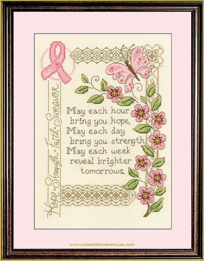 Brighter Tomorrows... COMPLETE. Stitch Count: 104v x 141h. Size Approx: 8.5"x 11" (20 x 28cm) A beautiful inspirational design! A stunning design for those who need an extra prayer and support. We wish everyone "Brighter Tomorrows". This design is one of several in a series. A portion of the proceeds from this design will be donated to Susan G. Komen for the Cure. A sweet inspired cross stitch design by the Renowned cross stitch designer Diane Arthurs. Cross Stitch pattern by The American Imaginating Studio. Cross Stitch Design stitched on 14ct. Natural Aida.