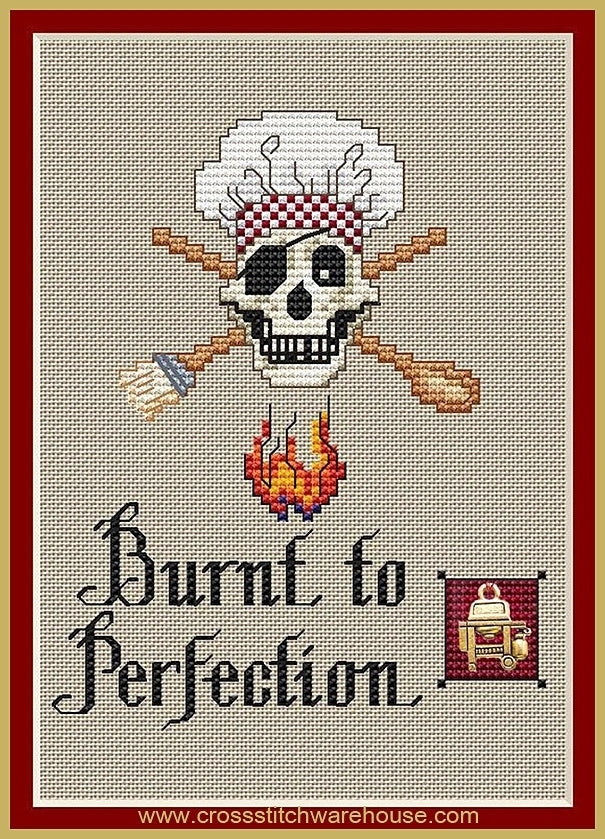 Burnt To Perfection... Cross Stitch CHART by Sue Hillis Designs. Size: 4.2"x 5.2" (10.6 x 13.2cm) Cross Stitch Size is: 59 x 74 stitches. Argh! Meet our collection Pirates! Pirates know how to use fire, and these days that means they have become masters of the backyard Bar-B-Que grill! With crossed cooking implements which include the brass-toned grill charm, this hungry pirate charcoals everything he cooks, which proclaims "Burnt to Perfection!" So "toast" your favorite backyard buccaneer with this whimsical cross stitch design. When cross stitched on 14ct. Lite Khaki ~ Beige or Parchment, or "over two threads" on 28ct. Matching Linen or Evenweave, this design fits perfectly into a standard 5"x 7"Frame.