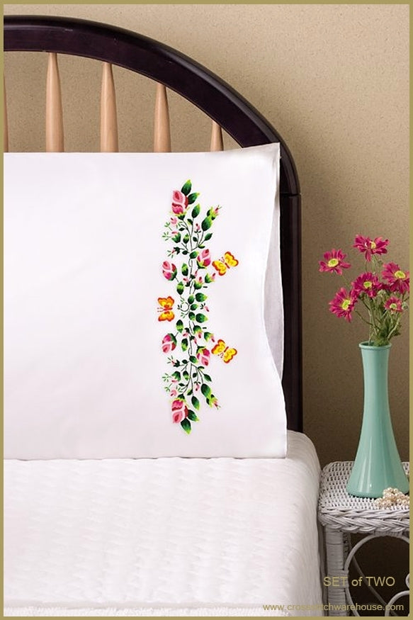 Butterflies and Roses PILLOW CASES... Set of Two. STAMPED Cross Stitch & Embroidery by Design Works. Stamped for embroidery on #180 thread count poly/cotton, standard size pillowcases. These pillow cases in stamped cross stitch/embroidery, remind us each day of how we can create heirloom pieces that inhance our home decor. "Hey, I Made This" All designs in the series are designed with lovely pastel colors. Package contains two standard size pillowcases, polyester/cotton pillow cases stamped in wash-away ink, and easy instructions with a thread shopping list. NEEDLE & THREAD NOT INCLUDED