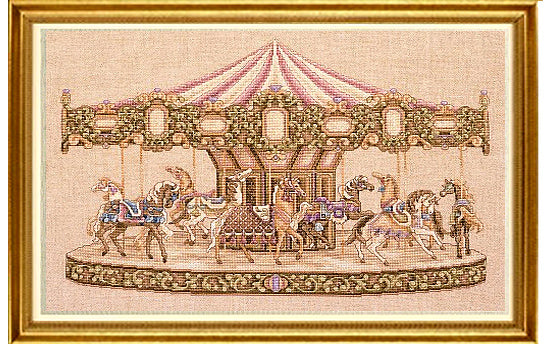 Carousel... Designed by Teresa Wentzler. Finished Size: 11.5"x 18.25" (29.2 x 46.4cm) A Counted Cross Stitch complete Design. A True old-time French Carousel with detailed carved horses and organ music playing under the striped canopy of this ornate magically antique carousel. Cross Stitch is in a time period in the true Teresa Wentzler style. An all-time Teresa Wentzler classic! The detail is fabulous! Features of this cross stitch design are the beautiful period olde time look, combined with its delightful detail.