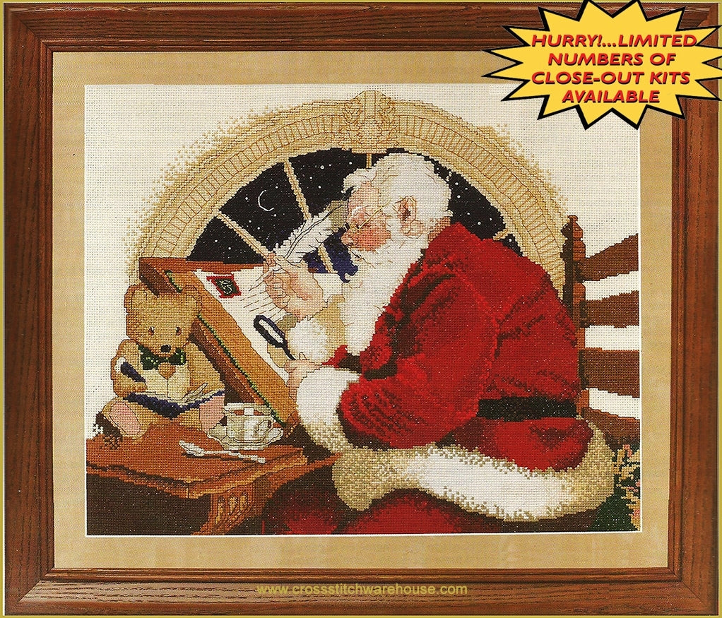 Checking It Twice... Counted Cross Stitch Kit. Size: 12.5"x 16" (31.8 x 40.6 cm). I have seen a lot of Christmas designs in cross stitch featuring Santa! This one excels because of its size. Santa's concentrating on his list so that not one little child will be overlooked on that special night of the year.