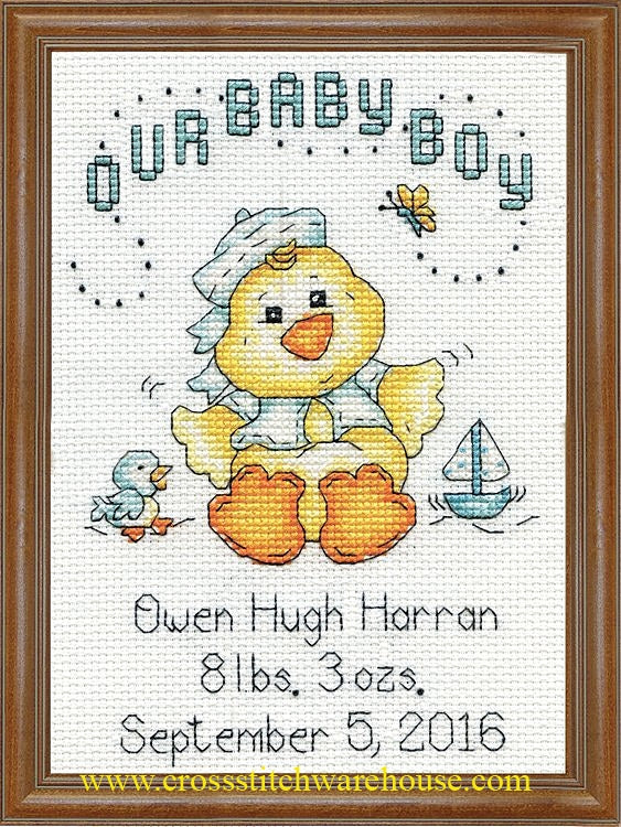 Boy Chick Birth Record... MINI Counted Cross Stitch Kit by Design Works. Finished Size: 5"x 7" (13 x 18cm). A Wacky Little Baby Boy Chick birth record. Quick to do the project for a surprised arrival.