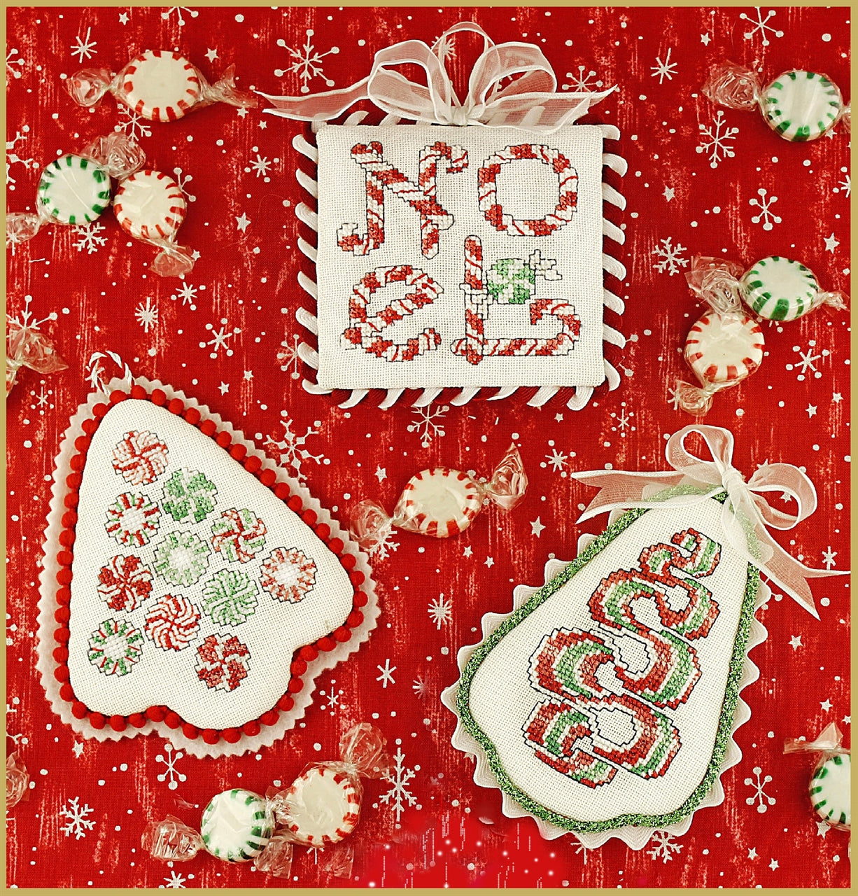 Christmas Candy Ornaments... Cross Stitch CHART by Sue Hillis Designs. Finished Approx Size: 3.3"x 3.9" (8.4 x 9.9cm) Size In Stitches: The largest design is 47 stitches wide by 55 high. The smallest is 34 stitches wide by 52 high.... A tasty colorful collection to our favorite Christmas hard candies, in the fourth leaflet in our "Something New, Something Old" series. We have updated some of our favorite yummy candy designs and added some new ones too! These were stitched on "over two threads" on 28ct. Antique white Lugana with Sullivans Floss and Kreinik's Blending Filament for added sparkle! The leaflet includes templates and instructions to complete these delightful ornaments!