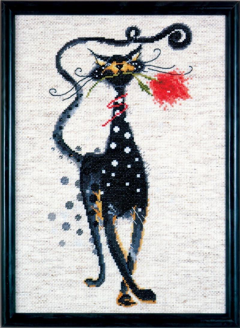 Jasper with Rose... Counted Cross Stitch Kit by Design Works. Size: 10"x 14"(25.4 x 35.5cm) A cross stitch design with a difference! You will love this wacky black polkadot cat elegantly posing which would create a great conversation piece, and will add a wacky contempory flavor to any room. LOOK for others in the series as Modern Classics. Size would also suit a Pillow. Kit comes complete with:-