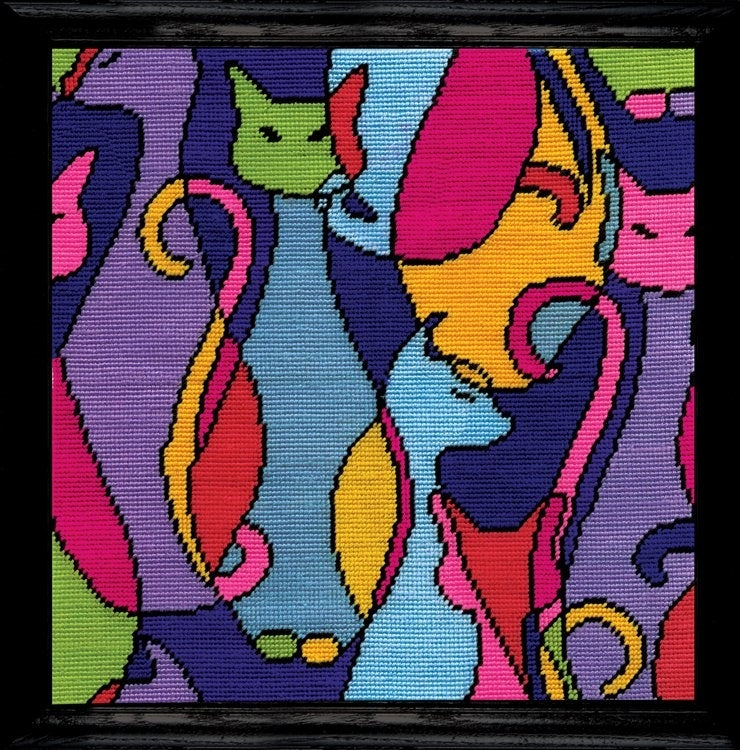Colorful Cats... NEEDLEPOINT Kit by Design Works. Finished Size: 12"x 12" (30.5 x 30.5cm). A brightly colored abstract design that is guaranteed to impress. It would suit a modern apartment. Stitch as a "Pillow or Picture" Photo shows the design stitched as a pillow, no pillow backing included! Printed in full color.