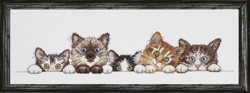 Curious Kittens... Counted Cross Stitch Kit by Design Works. ~ Finished Size: 5"x 18" (13 x 45.7cm) ~ Curious Kittens shows a row of sweet kitties all ready to get into a heap of trouble. A great design for those ladies who can't have enough kitties around. Kit comes complete with:-