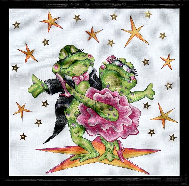 Dancing Frogs... Counted Cross Stitch Kit by Design Works. Finished Size: 12"x 12"(30.5 x 30.5cm) "Dancing With The Frogs!"A Novelty cross stitch design showing Green Tree Frogs Dancing in a Frogroom Cabaret. Remember, you may feel this way the morning after your night out when you look in the mirror. The Bright Blend of colors in this design is superb. Design size would also suit a Pillow.