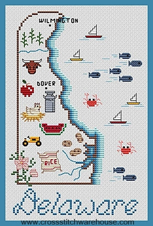 Delaware... Cross Stitch Chart by Sue Hillis Designs. Finished Size: 5"x 7.6" (13 x 19.3cm) Cross Stitch Size In Stitches: Design is 71 by 107. Cross stitch state maps include symbols for the major state industries and the state capital.