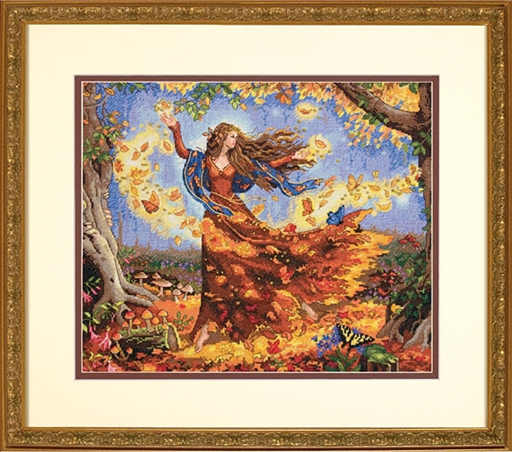 Fall Fairy... GOLD COLLECTION in Counted Cross-Stitch by Dimensions. Size: 14"x 12" (36 x 30cm).This is the most Magnificent Fantasy design. With wind and leaves swirling around her, a beautiful Fall Fairy makes her way through the woodlands. This stunning Gold Collection design in counted cross stitch features rich autumn colors ideal to display during harvest time... From the Gold Collection and Designed by Ruth Sanderson.