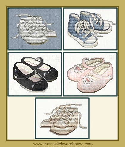 First Steps... CHILDREN Cross Stitch CHART by Sue Hillis. Size: 3.5"x 4.5" (8.9 x 11.4cm) Cross Stitch Size in Stitches is: 63 wide by 49 high. This adorable leaflet has five sweet bootie designs of vintage baby shoes. The white leather high tops have a white color scheme as well as a sepia-toned variation. The little Mary Janes design brings back memories of our innocent little girls before the tattoo and piercing era! The leaflet includes two alphabets to personalize this cross stitching project. A cute idea of a quick stitching present to celebrate the arrival of a cherished newborn... Need fabric? Choose your fabric from our fabulous range when ordering.