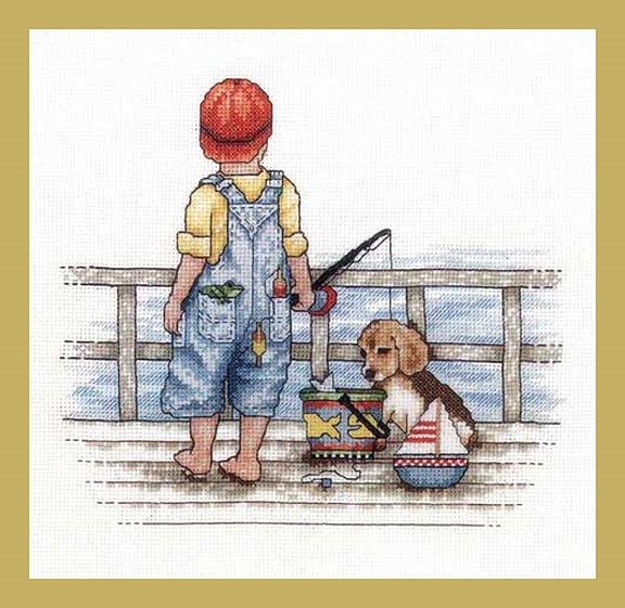 Fishing... Cross Stitch CHART by Bobbie Gee Designs. Finished Size: 8"x 9" (20 x 23cm). Peaceful afternoon scene at the jetty featuring a boy and his puppy trying to bring home a catch. Design shown is stitched on 14ct. White Aida. Cross Stitch is also available as a kit.