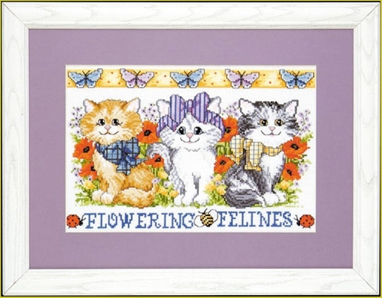Flowering Felines... Counted Cross Stitch by Design Works. Size: 8"x 12" (20 x 30.5cm) "Hatty, Kitty & Netty!" A cute Kitty design of three Kitty's posed for a photo shoot amongst the poppies and butterflies.