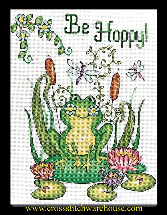 Frog Bouquet... Counted Cross Stitch Kit by Design Works. Finished Size: 8"x 10" (20 x 25.4cm). A delightful novelty cross stitch design showing a happy Frog at home in the pond with waterlilies. An ideal gift for a boy's room, would make a great starter kit. Cross Stitch features bright color tones.