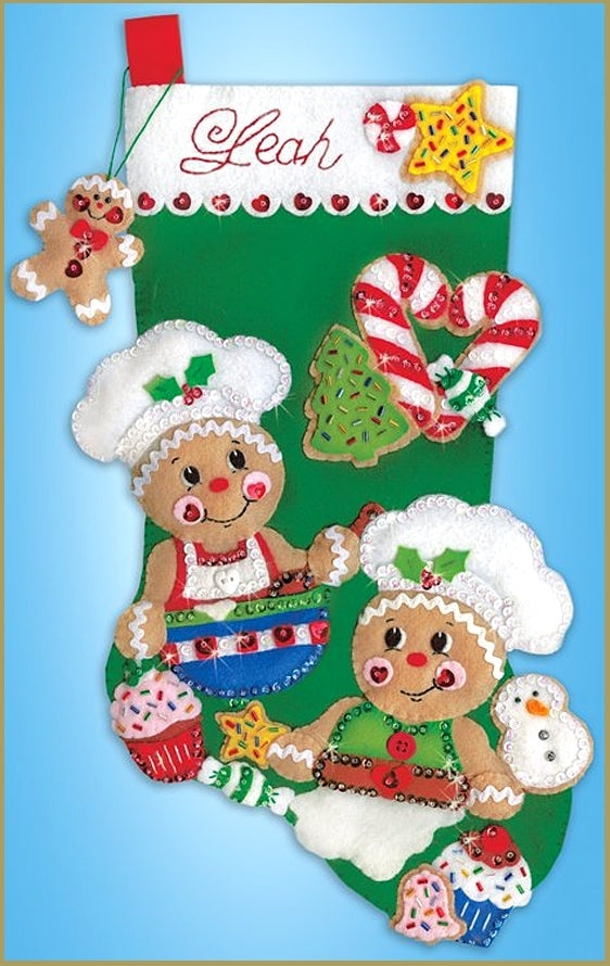 Gingerbread Bakers STOCKING... FELT Stocking Kit by Design Works. Size: 18" (45.7cm) Diagonal. Christmas stocking brings a special wintery feel to Christmas, and will make an eye-catching decoration for happy gleeful holiday fun. Felt appliqué stocking kit includes: Needle, presorted 100% cotton Floss, wool yarn, trims, acrylic yarn, stocking back, printed acrylic felt, color-sorted sequins and beads, (Parts may vary) with step-by-step Fully Illustrated chart & instructions.