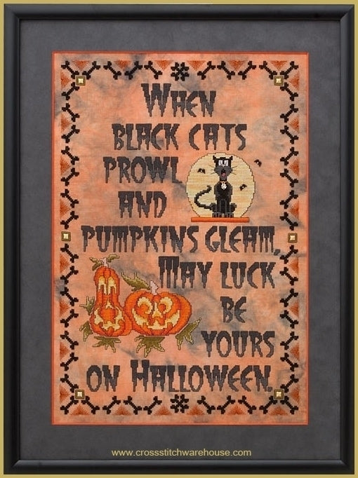 HALLOWEEN LUCK... Cross Stitch CHART & FABRIC by Glendon Place. Design Size: 18"x 27" (45.7 x 68.6cm) Wow' what can I say! This fabulous design is stitched on the most beautiful cross stitch fabric ever especially dyed for this LARGE exquisite design!... Fabric: 28ct. “Eek!” Cashel Linen hand-dyed by "Picture This Plus" Stitch Area: 171w x 250h... Stitch Count: 169w x 246h... The Design Area is; 12″x 17.5″. HALLOWEEN LUCK at it's best. You'll get a kick out of this design, great colors, great Verse, and it finishes with superb detail. The cross stitch design is inspired by an old Irish Halloween saying. (Thought, after a Liquid diet on Halloween night with too much Irish Guinness) will make the design look even more spectacular! That's the Luck-of-the-Irish?
