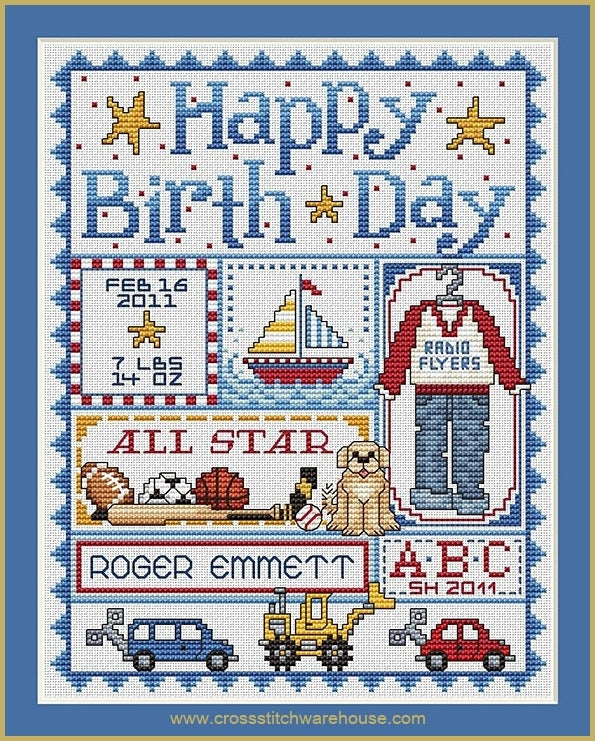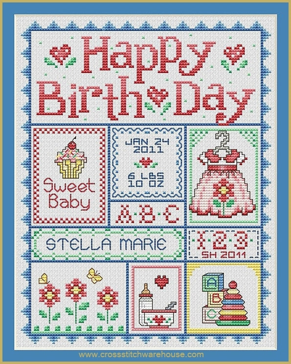 Happy Birthday, Girls... BIRTH RECORD Cross Stitch CHART by Sue Hillis. Size: 6.8"x 8.8" (17.3 x 22.3cm) Cross Stitch Size in Stitches is: 95 wide by 123 high. Welcome your precious new baby girl to the World with this bright and cheerful birthday styled sampler. Here you will find all of the special things that little girls love with room for her name, date of birth, and weight. When cross stitched on 14ct. Aida, or "over two threads" on 28ct. Linen ~ Evenweave, this design will fit perfectly into an 8"x 10" Frame.