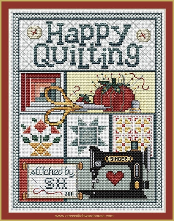 Happy Quilting... Cross Stitch CHART by Sue Hillis Designs. Size: 6.7"x 8.8" (17 x 22.3cm) Cross Stitch Size In Stitches is: 94 wide by 123 high. Let's celebrate Happy Quilting Day. The perfect design for any quilter! Every quilter will recognize these cherished tools and many accessories used for quilting. Here are Grandma's old-fashioned sewing machine and the cute little tomato pin cushion along with different quilting block patterns she may have used. Use the scroll rod square to personalize with your initials and year. An alphabet and number chart are also included for personalization. When cross stitched on 14ct. Aida, or "over two threads" on 28ct. Linen or Evenweave, this design will fit perfectly into an 8"x 10" Frame. Need fabric?