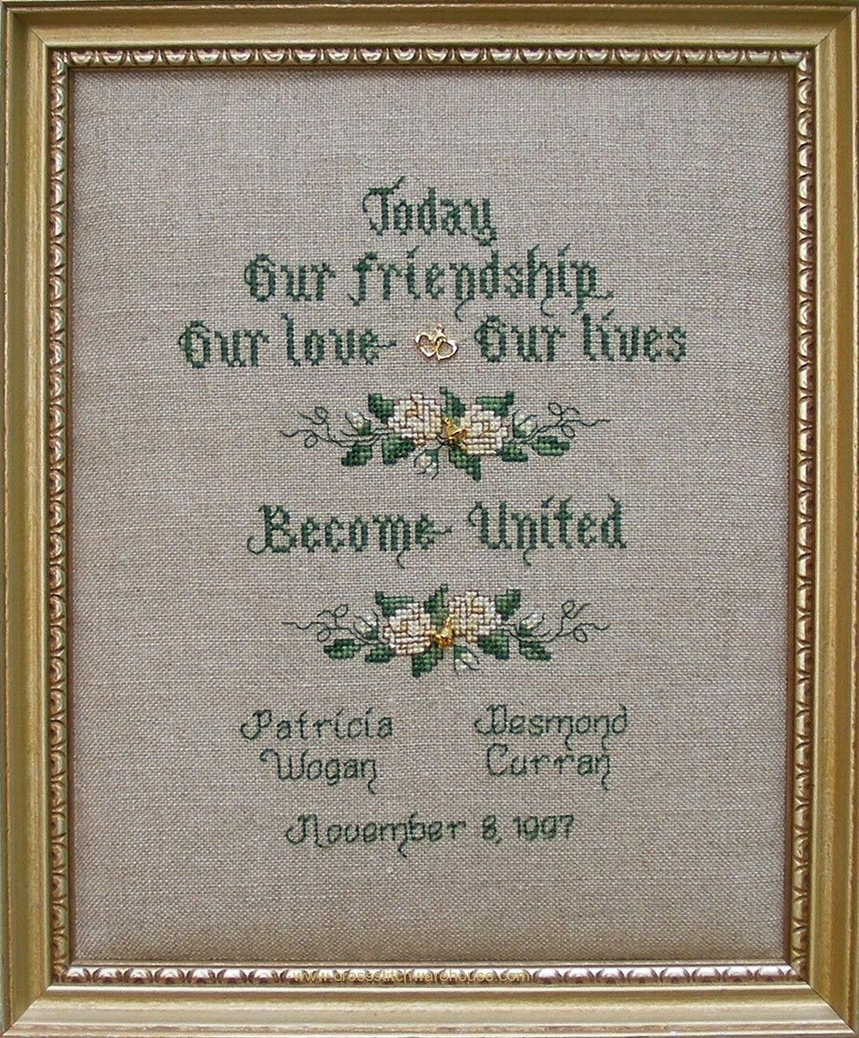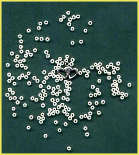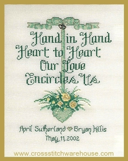 Heart To Heart... Cross Stitch CHART by Sue Hillis Designs. Size: 6"x 8.3" (15.2 x 21.8cm) This cross stitch features two silver heart charms intertwining as the love of the happy couple that receives this keepsake of their wedding day. Beads also add a sparkle to the cross stitch. Alphabet also included personalizing. Charm and beads included. When stitched on 14ct. Aida Antique White/Ivory or "over two threads" on 28ct, this project will fit perfectly into a standard 8"x 10" Frame.