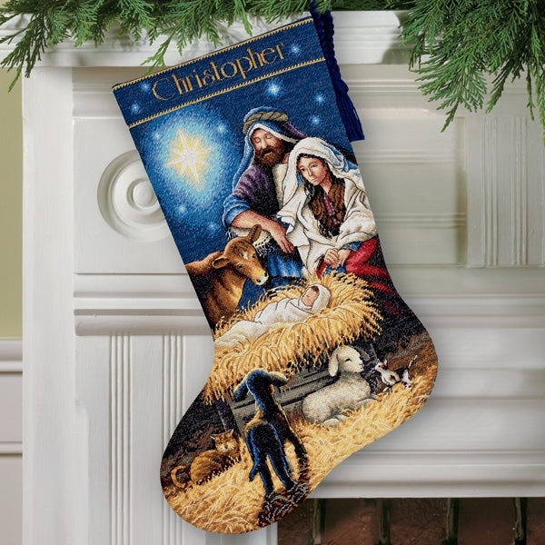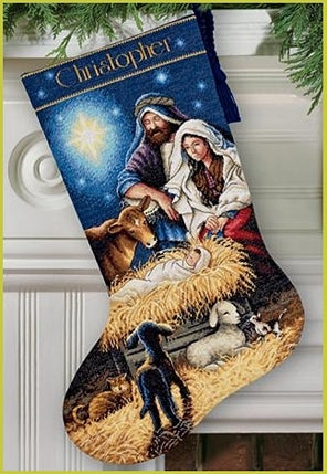 Holy Night Stocking... Approx Finished Size: 16" (41cm) This Inspirational Counted Cross Stitch Kit "Holy Night" Christmas scene Stocking kit is stitched on 18ct. Ivory Aida. This counted cross stitch design is sure to be a treasured heirloom. Designed by Richard Jesse Watson. © Richard Jesse Watson. By arrangement with Mill Pond Press, Inc.