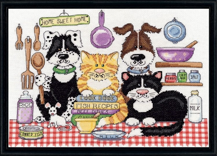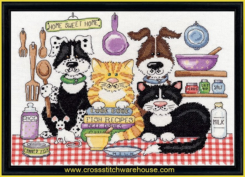 Home Sweet Home... Counted Cross Stitch Kit by Design Works. Size: 10"x 14" (25.4 x 35.5cm). A colorful novelty cross stitch design for dog & cat lovers. The design shows two dog & two kitties cooking up some fish cakes while making a mess in Home Sweet Home. This design needs very little cross stitching experience to complete.