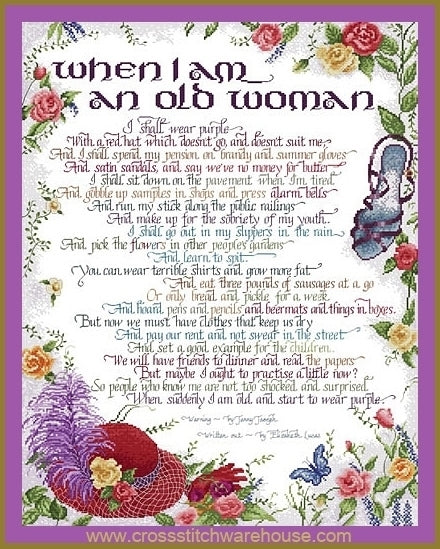 I Shall Wear Purple... LARGE Cross Stitch CHART by Sue Hillis Designs. Finished Size: 3.5"x 4.9" (9 x 12cm) Size In Stitches: is: 246 by 313. The Red Hat Society is a social phenomenon that began as a result of a few women deciding to greet middle age with verve, humor, and elan and Jenny Joseph's poem which says it all! Sue Hillis Designs have purchased the licensing rights to put the poem into cross stitch. The many beautiful colors which make this project especially enjoyable to cross stitch are watching the flowers and vines grow & bloom before your eyes!... I just love it, well done Sue!