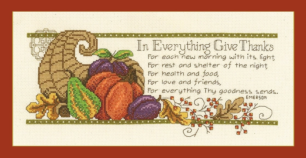 In Everything Give Thanks... CHART ONLY. Finished Size Approx: 6.5"x 13" (16.5 x 33cm) Stitch Count: 76v x 178h. A colorful time of the year that we all enjoy. Give Thanks, design features a lovely arrangement in the autumn style. A cross stitch by Renowned cross stitch designer Diane Arthurs. A Cross Stitch pattern by The American Imaginating Studio. Cross Stitch Design is stitched on a 15"x 18" piece of 14ct. Natural Aida. Included.