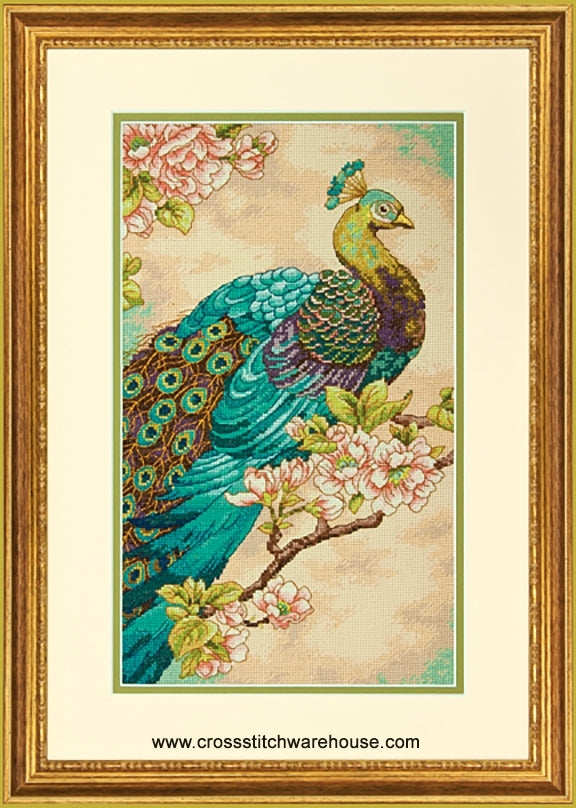 Indian Peacock... Counted Cross-Stitch by Dimensions. ~ Finished size: 9"x 15" (23 x 38cm) ~ With its distinctive crest and ornamental train of feathers, the Indian Peacock is one of the most beautiful birds you will ever see. This counted cross stitch masterpiece from Dimensions is sure to become a cherished heirloom. Designed by Suzanne Nicoll. © Suzanne Nicoll.