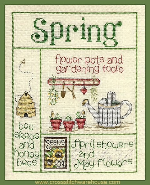 It's Spring... Cross Stitch CHART by Sue Hillis. Finished Size: 7"x 9" (18 x 23cm) Cross Stitch Size in Stitches is: 98 by 126. A Welcome to my garden. Bee skeps and honey bees, April showers and May flowers! When cross stitched on 14ct. Aida, or "over two threads" on 28ct. Linen ~ Evenweave, this design will fit perfectly into a 8"x 10" Frame.