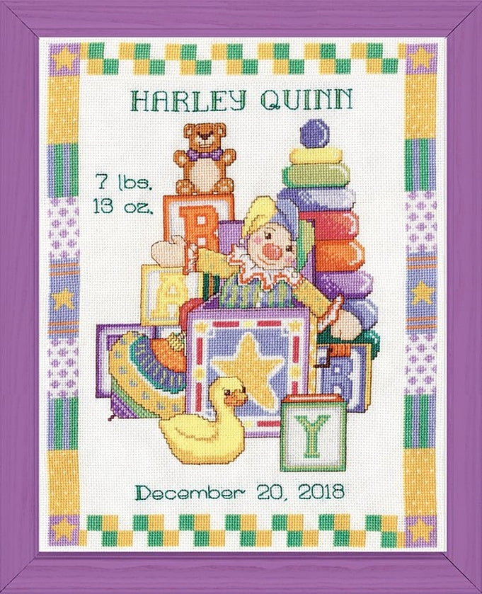 Jack In The Box Birth Record... Boy, Counted Cross Stitch Kit by Design Works. Finished Size: 11"x 14" (28 x 35.5cm) A lovely cross stitch birth record design for a Little Boy's nursery, showing a stack of colorful toys. Personalize with Name and Date -Cross Stitch comes complete with 14ct. White Aida. Needle, 100% cotton floss & easy-to-read instructions.