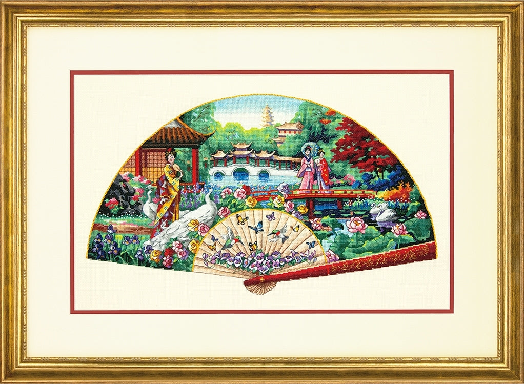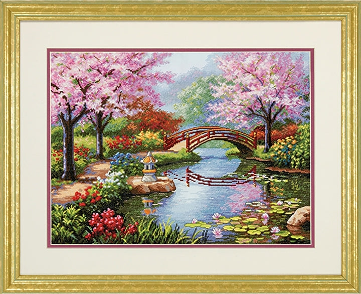 Japanese Garden... GOLD COLLECTION in Counted Cross Stitch by Dimensions. Finished Size: 16"x 12" (40.6 x 30.5cm). Take a stroll through this lush Japanese Garden Setting. This colorful masterpiece from The Gold Collection features exquisite shading and detail using metallic thread accents. Designed by Sung Kim. © Sung Kim. Licensed by Bentley Licensing Group.