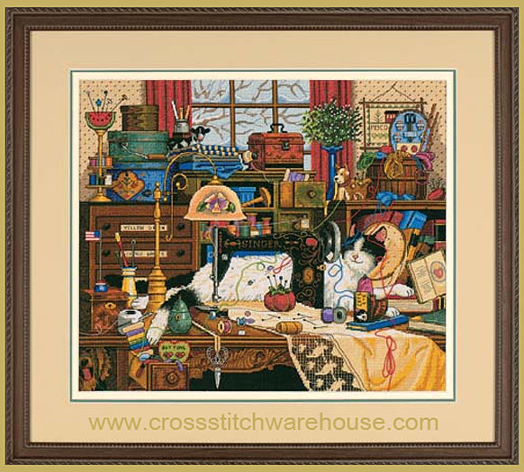 Kitty Sewing Lesson... Counted Cross Stitch kit by Design Works. ~ Size: 16"x 20" (40.6 x 51cm). ~ Design Works have truly captured this colorful sewing room, showing all that makes a craft room what it is, with Kitty playing tirelessly among her Moma's sewing n' knitting collection. This cozy scene is filled to the brim with captivating details couldn't resist this priceless cross stitch?