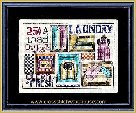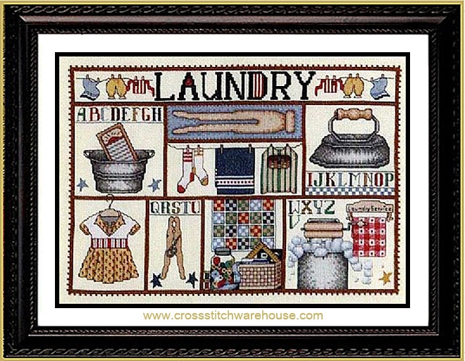 Laundry Sampler... Cross Stitch CHART by Bobbie Gee Designs. Size: 9"x 13" (23 x 33cm). Whether or not you love washdays doesn't really matter, but after stitching this laundry sampler you'll get a great kick from hanging it in the laundry. Design shown is stitched on 14ct. Natural Aida. Cross Stitch is also available as a kit.