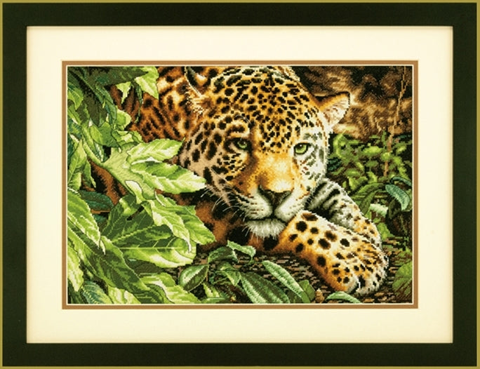 Leopard In Repose... GOLD COLLECTION by Dimensions. ~ Size: 16"x 11" (41 x 28cm) This Leopard in Repose has the hallmark traits of a Gold Collection design with the quality interpretation of the original artwork, realistic shading, and detail, and a beautiful palette of thread colors to complete this counted cross stitch beauty that will be cherished by any wildlife enthusiast. Stitched on 14ct. Natural Aida and Designed by Collin Bogle. © Collin Bogle. Courtesy of MHS Licensing, Inc.