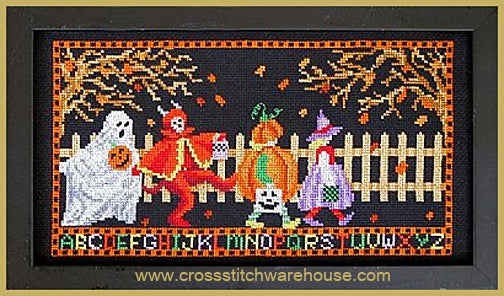 Lets Go Trick or Treating... Cross Stitch CHART by Bobbie Gee Designs. Size: 6"x 11" (15.2 x 28 cm). A spooky Halloween design featuring all your creepy pals heading out for some Ghostly Halloween fun. Design shown is stitched on 14ct. black Aida. The design is also available as a kit