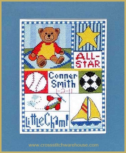 Little Champ... Cross Stitch KIT by Bobbie Gee Designs. Size: 5.1"x 7.1" (14 x 19cm) A delightful Birth Record Design for a little Champ. This cross stitch design would make a lovely addition to any nursery.