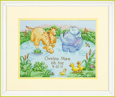 Little Pond Birth Record ... Counted Cross Stitch Kit by Dimensions. Size: 12"x 9" (30 cm x 23cm). Delight new parents with our Little Pond Birth Record in counted cross stitch. Cute animals highlight personalized baby details. Designed by Cathy Heck. © Cathy Heck.