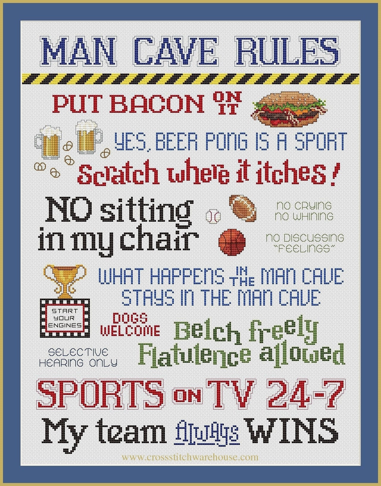 Man Cave Rules... Cross Stitch CHART by Sue Hillis Designs. Size:13.5"x 16.7" (34.3 x 42.4 cm) Size In Stitches:189 wide x 234 high. Every Guy needs a Cave or Shed!... But Really, there have to be some rules for the man cave, OK, and they're not the usual rules... Beware, so think twice before entering! The owner of any man cave will surely love this cross stitch cave sign! It's colorful, and it's fun, and fun to stitch, besides He'll love it! When stitched on 14ct. Aida, or 28ct. Evenweave or Linen, this design fits perfectly into a standard 14"x 18" (35.5 x 45.7cm) Frame. Our model was stitched using 100% Egyptian Cotton embroidery floss "over two threads" on 28ct. "Antique White" Evenweave.