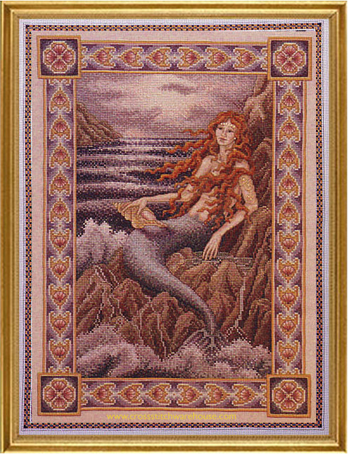 Mermaid... Designed by Teresa Wentzler. Finished Size: 11.75"x 15.9" (29.9 x 40.4cm). A Counted Cross Stitch Design complete with pattern, fabric & threads. Mermaid Fantasy is another classical timeless Teresa Wentzler Sampler design, which features a rustic eerie dawn scene of a long auburn haired Mermaid relaxing on the morning sun-drenched wave-battered rocks, before re-entering her fantasy undersea world. The design is surrounded by a beautiful shell & wave motif artistic border, which will add a seagoing adventure theme to a study or library. Cross Stitch is delightfully detailed with closely blended colors to create the fantasy effect, with specially chosen 28ct Platinum fabric.