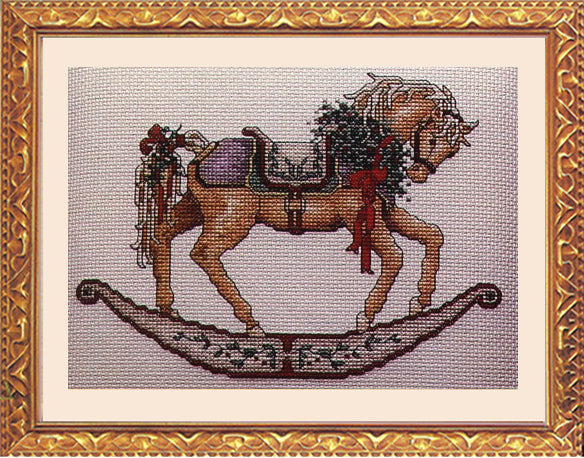 Chestnut... Designed by Teresa Wentzler. Finished Size: 5"x 6.75" (13 x 17.2cm) A Counted Cross Stitch Design. A True old time collection of six different rocking horses: Chestnut: Pictured: A Palamino in colorful Christmas decor. Trotter: A grey with pastel features. Misty: A chestnut with beautiful spring flowers and a quilt cover. Dancer: A grey with Arabian style trim. Diamond: A chestnut with a Southwestern Native flair. And Sweetheart: A grey trimmed beauty with hearts, ribbons, and flowers.