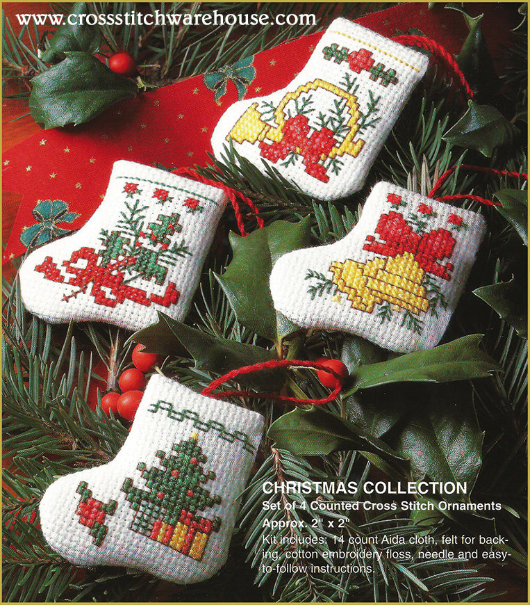 Mini Stockings Ornaments... Set of 4 ~ Counted Cross Stitch Kit, Made in the USA by Bucilla. Size: 2" (5.1cm) A festive collection of detailed Mini Stocking ornaments in Counted Cross Stitch which create colorful ornaments. A great value ornaments kit.