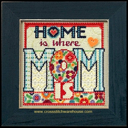 Mom... Counted Cross Stitch Buttons & Bead Kit with Frame by MILL HILL... Size: 5"x 5". (12.7 x 12.7cm)